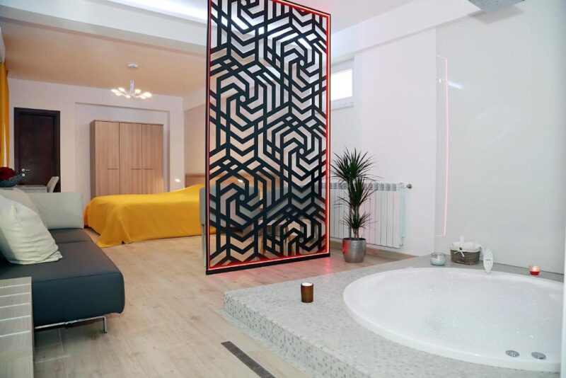 Jacuzzi în cameră oferă o experiență de relaxare discretă și intimă, perfectă pentru cupluri. Recepția funcționează non-stop, facilitând accesul oricând. Barul și salonul reprezintă spații comune unde se poate petrece timpul într-un ambient liniștit. Hotelul se află într-o zonă urbană, aproape de puncte de interes din București, ceea ce permite explorarea orașului cu ușurință.